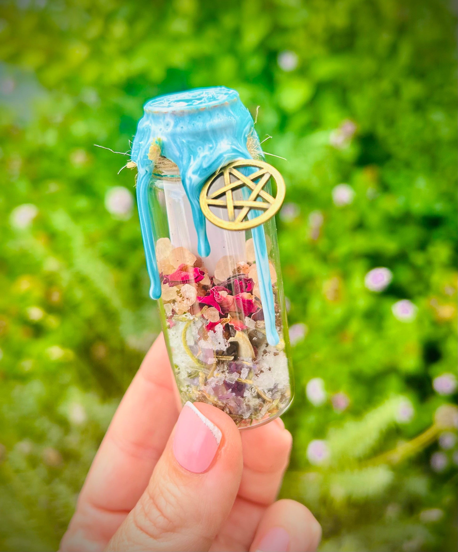 Each of our spell jars are cleansed, uniquely crafted and charged with kind and loving intention, tied with a pentagram charm for protection, then sealed with a cork and wax in a colour that aligns with the intention inside.